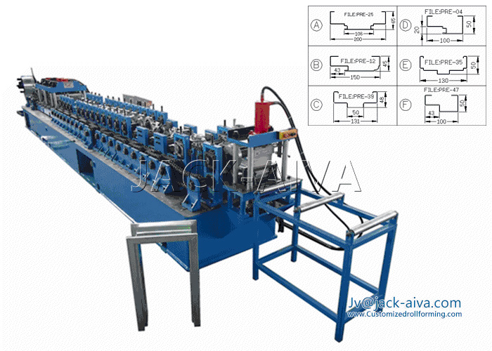 The whole metal doorframe roll-forming line is consisted of de-coiler, Main forming machine, Hydraulic cutting part, run-out table, electrical system. Rollers on the line also named moulds, the material can be processed through rollers continuously, until to get the required profile. Rollers are including the flat roller, middle equipment, side rollers and flatting rollers. Normally the roller material is designed with SKII, the bearing steel after exactitude processed and special treated. All the rollers shape is designed by the professional software, “cool bending aux designing software”. The most advantage is to get the most reasonable rollers shape with its position on the line. so that to get the high precision profiles.
